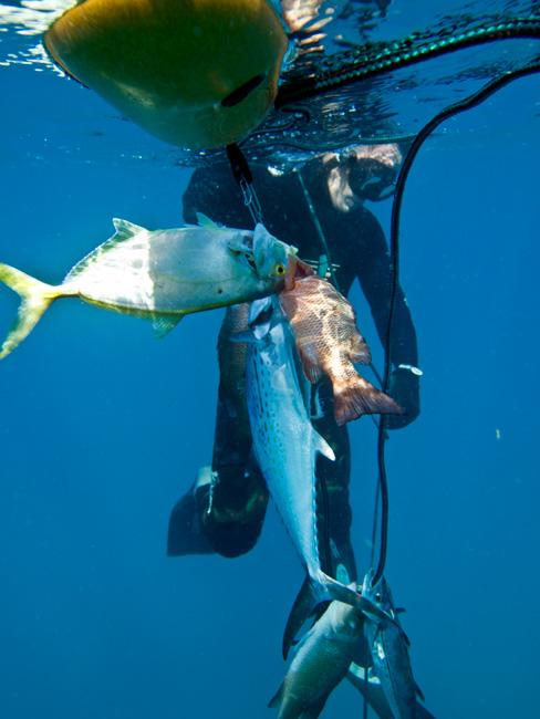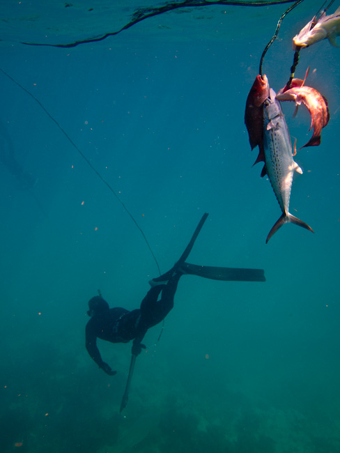 We headed out and drove around in the green water for a little bit. After a while we stopped burning gas and just jumped in on some shallow rocks, in around 20 feet of water. After a little while of swimming and seeing groupers which we are not allowed to take, we decided to just blast the hell out of the dozens of Spanish mackerel that were swimming around us. It was actually a pretty awesome time. Shooting as fast as you can reload is a lot of fun. Sure the Spanish macs are usually only a couple pounds, and probably one of the least prestigious fish you can shoot but what other fish is available that you can just go nuts and shoot one after another of. We shot and shot, missing , hitting, cutting up the real little ones to draw in the bigger ones. I saw one kingfish that came in on the commotion, but my gun wasn’t loaded so I got to watch him just swim away. I shot a bonita which was a first for me. Rafi got a photo, which hopefully he will send to me.