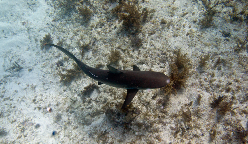 Next I let Catherine drift with the camera while I ran the boat. She has been trying to fight the ocean and make it through the winter wearing only a 3mm wetsuit, and she has been failing miserably. She is usually shivering and in the boat before even half the day is done. Finally today she wore the 5mm and she was able to stay in the water all day. She got photos of bar jacks , barracudas, other fish. Then after we figured the current was light so anchored very shallow and swam together. It was fun to snorkel in the shallows. I shot another yellow jack and had a couple reef sharks come in and then back off. One of the reefies was small but the other was very big for a reef shark and he looked bigger then me. I figured being the only person with the a gun, we should probably stick closer to the boat in case they got very fired up. On the way to the boat I shot another bar jack and the sharks appeared again. I wasn’t sure if they were the same sharks or what. Once I got the fish under control and in the boat, I just said screw it and threw the bonita from the other day in. It seemed like sharks came from all directions, I counted 5 in all. The really big one didn’t show but another bigger one did, and bunch of little ones. The big ones seem much more scared of people then the little ones. After a little bit Catherine had taken so many bursts of raw images with the camera that the battery died, so we left.