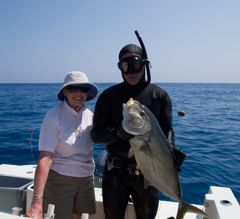I followed a 25# cubera on the bottom in 50 feet of water for awhile. I think that cubera snapper in general almost try to drown freedivers. They swim along just out of range, so you keep telling yourself if I just follow him a little longer… but in the end they don’t give you a shot. I shot one 15# horseye jack and “Big Boy”, this monster jewfish that lives at this one spot I dive inhaled him, and then ran under a ledge. I put everything I had into it and pulled the spear out of his mouth.