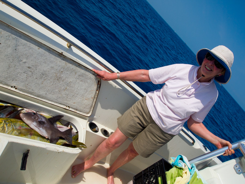 Catherine’s Mom is visiting and although we hadn’t planned on it we ended up out on the water. Catherine and she were going to go kayaking but the less then 5 knot winds allowed me to convince them otherwise. I was kind of skeptical on what the water would look like but when we got out there it was incredibly blue. On the reef line you could clearly see the coral and the fish swimming around. I dove all day while Catherine and her mom ran the boat. On the way out they watched flying fish and other bait jumping around, and also saw a free jumping sailfish.