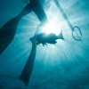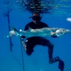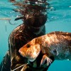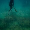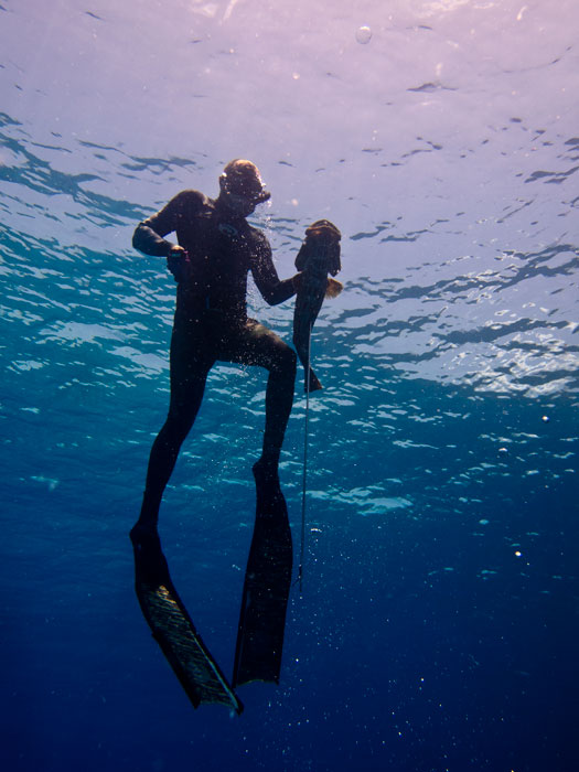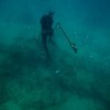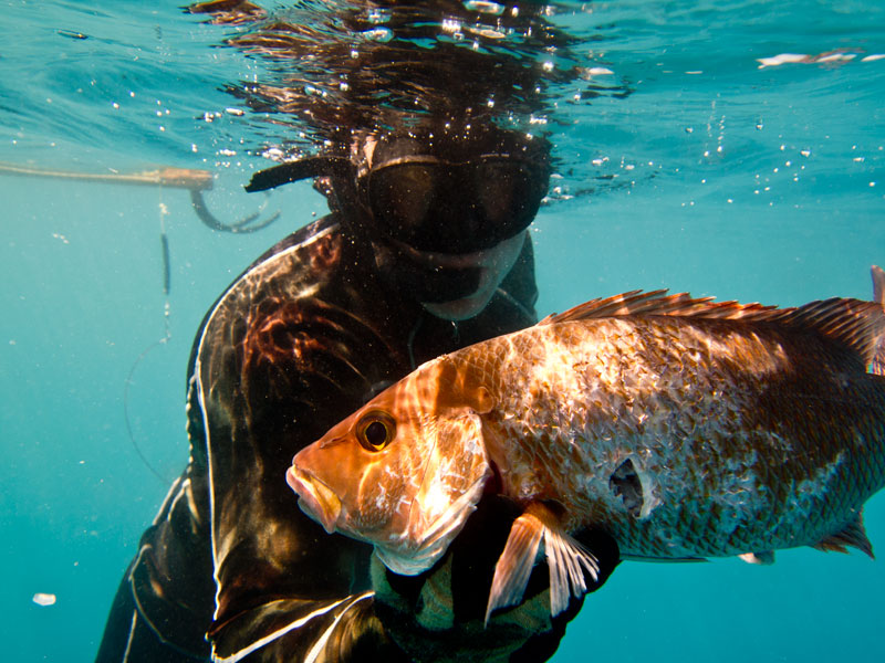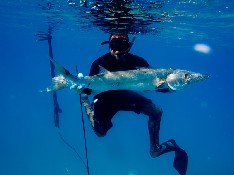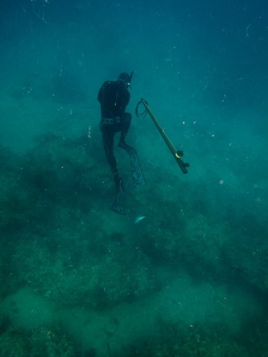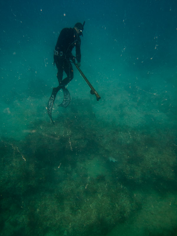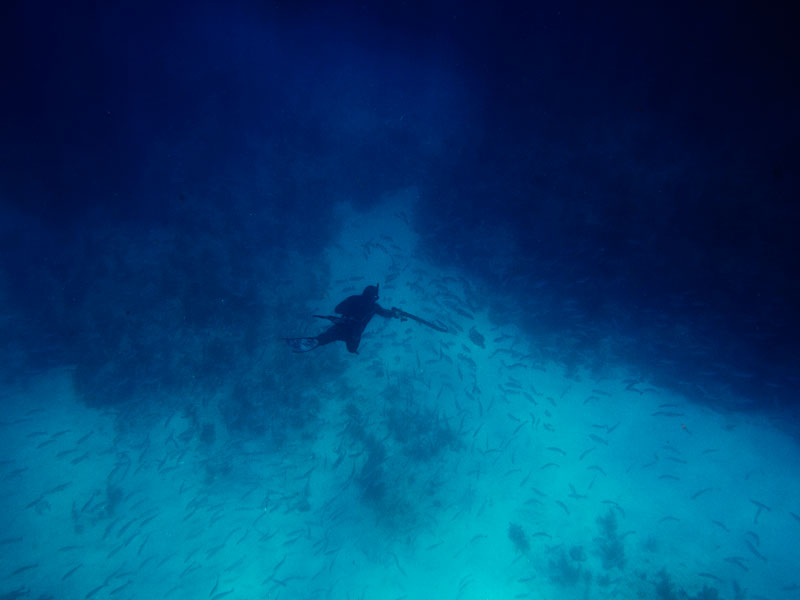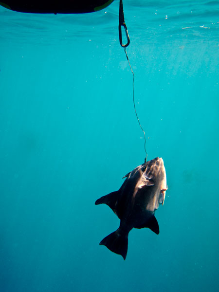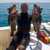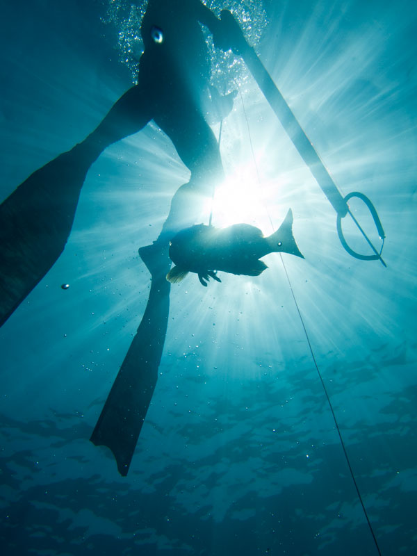 The huge schools of mangroves are still around but there behavior has changed back to normal. For awhile they were practically swimming into the spear, but now you can usually get one good one from the school and then the rest bounce. Catherine got a couple photos of me diving into a school of mangroves which was great. I just wish she had been with me last week. We found huge schools out west of grays, not only were there thousands of the them there were larger ones in schools for here, like 3-5# fish. The schools we saw yesterday had a lot of fish but the larger fish were around 3# max. Also last week there were huge schools of triggerfish shadowing the mangrove schools as well.