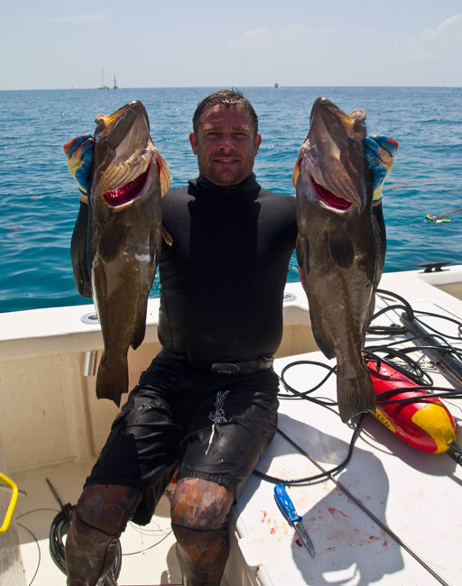 Yesterday was ok with Cat , Stoner , John and Andy. The conditions were ok but I could not shoot a fish to save my life. In addition to numerous misses, tear offs and gut shots, I also got the smallest grouper of the day, with a tail pincher right off the bat. Everyone else got decent blacks yesterday. But overall it was a good day on the water with fair to visibility and calm seas.